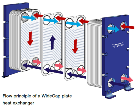 WideGap gasketed plate heat exchangers are designed for fibrous fluids and for fluids containing coarse particles. The wide gaps between plates allow fibers and particles to easily pass through the heat exchanger with minimum clogging.